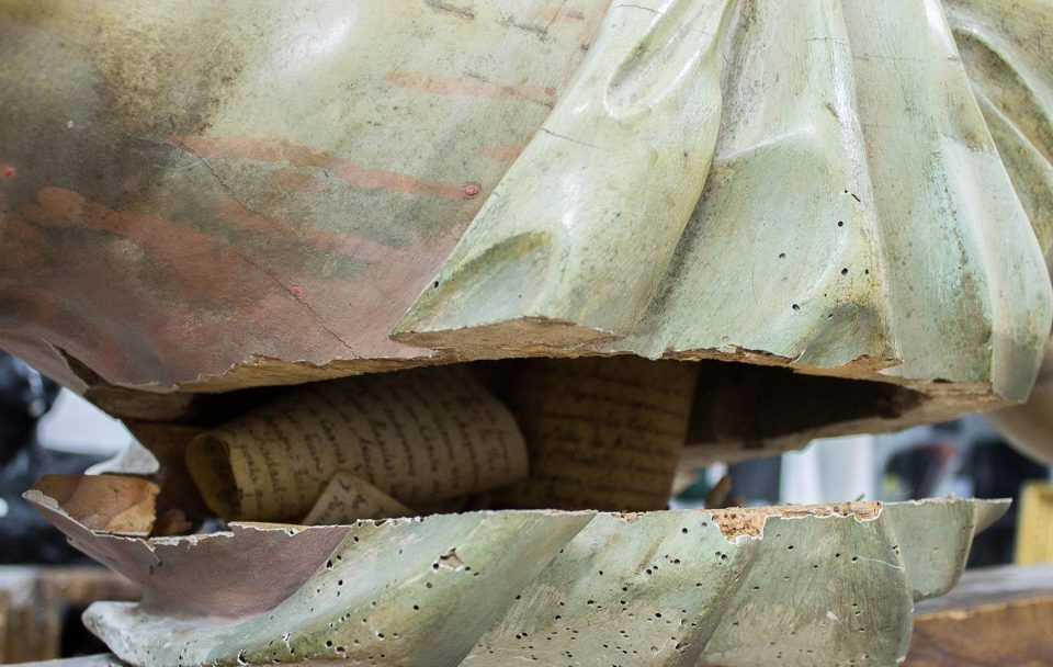 Tờ giấy được một linh mục viết cẩn thận vào năm 1777, nhét trong phần sau của bức tượng, tờ The Sun đưa tin.
