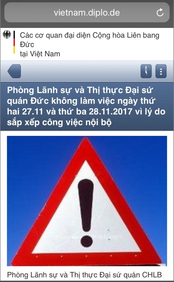 Một người Đức về Việt Nam du lịch bị mất cắp hành lý và giấy tờ đã tâm sự ´´Tôi đã gọi điện trước và có lịch hẹn tới Đại sứ quán Đức ở Hà Nội hôm 27.11 để xin cấp lại hộ chiếu mới, họ đã đồng ý, nhưng đúng ngày đó tôi tới nơi thì lại thấy thông báo đóng cửa 2 ngày liền ´´.