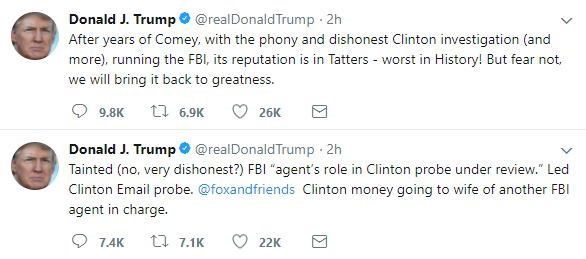 Tổng thống cũng tweet lại một bài đăng nói rằng Giám đốc FBI Christopher Wray "cần dọn dẹp lại nhà", cho rằng cơ quan này cần có cuộc đại tu dưới quyền Giám đốc mới Christopher Wray.