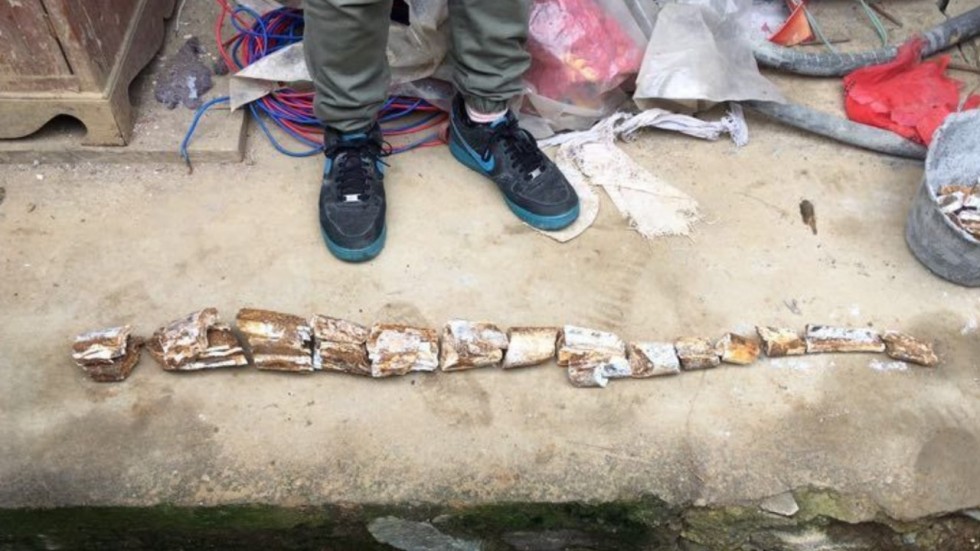 Nông dân Yin Faping nhìn thấy các mảnh ngà voi vào ngày 13.11 khi ông chuẩn bị đổ móng nhà ở huyện Hán Âm, tỉnh Thiểm Tây, Trung Quốc.