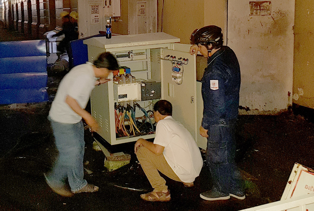 Nhân viên điện lực đang khắc phục sự cố. Nguyên nhân vụ cháy đang được làm rõ.