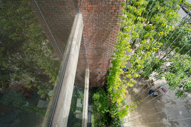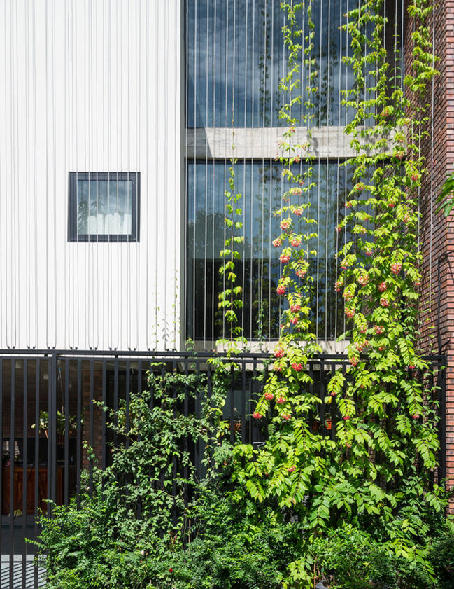 Bức tường gạch mộc lớn, mái vòm cong cùng dàn dây leo thanh mảnh tạo nên vẻ ngoài vừa thô mộc, cứng rắn lại vừa mềm mại, dịu dàng.