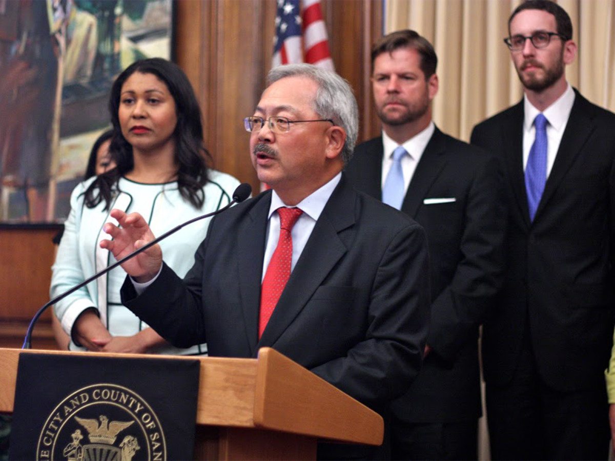Thị Trưởng Ed Lee đang thông báo về dự án xây thêm nhà trong năm 2015. Đứng gần ông là bà London Breed, người đã lên chức Quyền Thị Trưởng sau khi ông Lee qua đời vào sáng sớm thứ Ba, 12 tháng 12, 2017. (Kevin Kelleher/ S.F. Examiner)