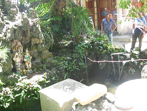 Hòn đá đặt giữa hồ, ngay gian chính điện. Cạnh đó là bàn thờ phật suốt ngày nghi ngút khói hương của lữ khách và phật tử xung quanh đến làm công quả cho nhà chùa. Vị sư này nói rằng, giữa không khí linh thiêng của Phật pháp, hy vọng hòn đá mang nhiều nỗi đau đời đó sẽ được gột rửa, làm nhẹ đi những nỗi oan khiên đầu rơi máu chảy mà ngược lại phù hộ cho dân làng yên ấm, hạnh phúc.