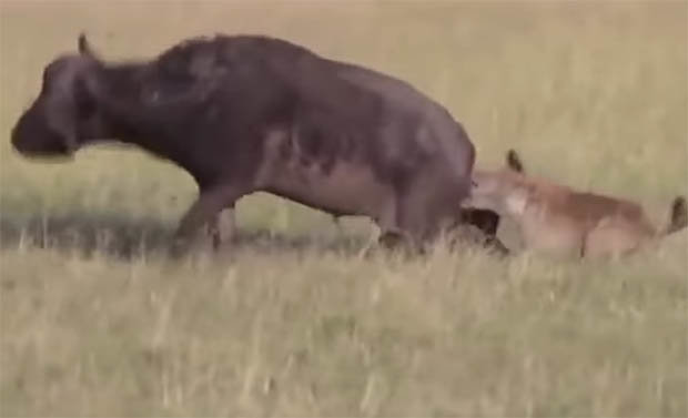 Linh cẩu cắn mạnh vào “của quý” của trâu rừng và xé mạnh, khiến cho nạn nhân gục ngã ngay lập tức.