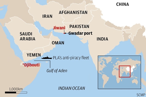 Trung Quốc dự kiến xây căn cứ hải quân tại Jiwani, gần cảng Gwadar, tỉnh Balochistan, Pakistan, do tàu quân sự đòi hỏi "những dịch vụ riêng biệt" mà các cơ sở thương mại không thể đáp ứng, SCMP đưa tin ngày 6/1.