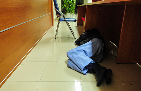 Bệnh nhân ngủ dưới gầm bàn tiếp tân của bệnh viện để chờ xạ trị.