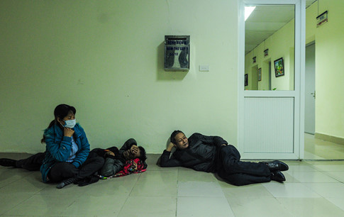 Bệnh nhân và người nhà mang cả chiếu đến để thay phiên nhau tranh thủ chợp mắt.