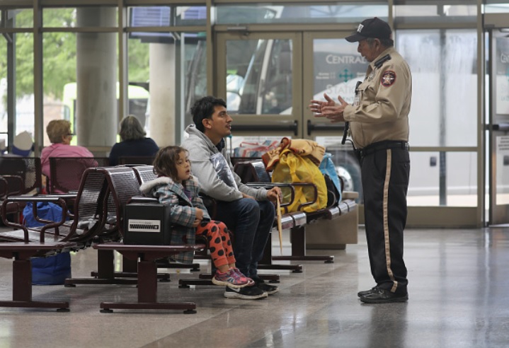 Một nhân viên an ninh tại một trạm xe bus đang nói chuyện với một di dân từ Salvador và con gái của anh ta tại McAllen, Texas. Di dân này hành nghề lái xe taxi. Theo một chỉ thị mới của chính phủ Trump, gần 200,000 người sẽ bị trục xuất về El Salvador, Trung Mỹ Châu. Họ từng được đến Mỹ định cư tạm thời theo một chương trình nhân đạo giúp các quốc gia bị thiên tai hoặc bị chiến tranh. (John Moore/Getty Images)