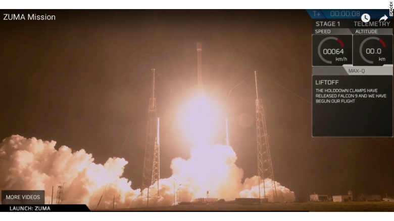 Trước đó, theo tuyên bố từ tập đoàn Công nghệ khai phá không gian SpaceX, họ đã thành công phóng tên lửa Falcon mang theo một vệ tinh bí mật của chính phủ Mỹ vào không gian. Động cơ đẩy giai đoạn đầu của quả tên lửa đã quay trở lại bệ phóng, trong khi động cơ đẩy giai đoạn hai tiếp tục mang theo vệ tinh bí mật Zuma tiến vào quỹ đạo tầm thấp.
