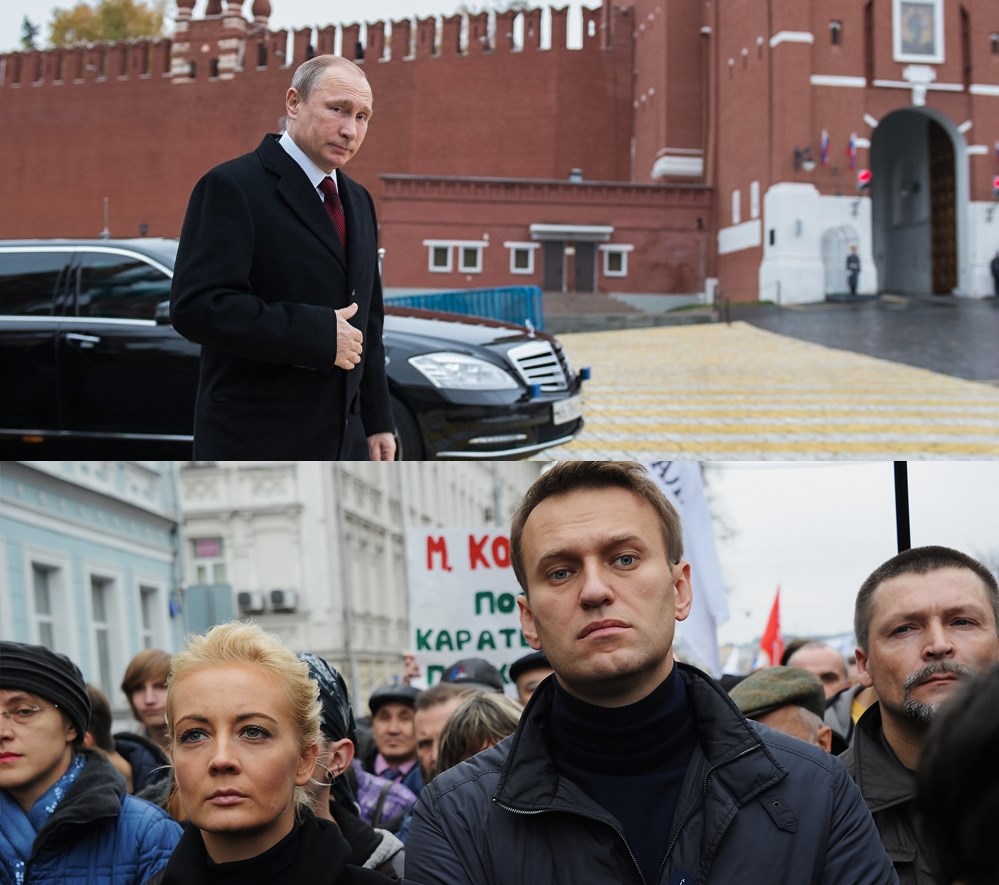 Tổng thống Nga Putin tại điện Kremlin (ảnh trên, nguồn ảnh: Sputnik) và thủ lĩnh phe đối lập Nga Navalny (ảnh dưới, hàng trước, thứ 3 từ trái sang, nguồn ảnh: Vox).