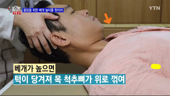 Tư vấn về trường hợp này, bác sĩ Lee Young Joo cho biết rằng, nếu bạn nằm gối quá cao thì phần cằm sẽ bị giật mạnh về phía trước và phần cột sống cổ sẽ bị co gập hướng lên trên gây cản trở quá trình hô hấp của cơ thể trong khi ngủ.
