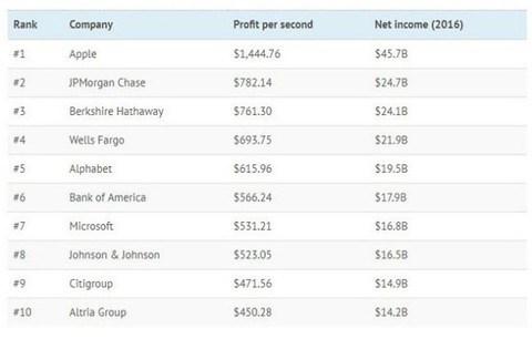 Theo thông kê mới từ TitleMax, lợi nhuận mỗi giây của 500 công ty có lợi nhuận lớn nhất nước Mỹ thì Apple đang dẫn đầu bảng xếp hạng.