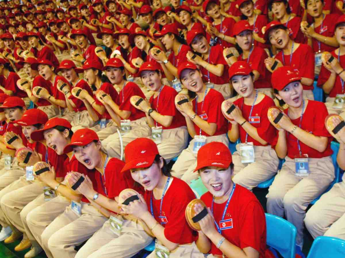 Ảnh chụp đội cổ vũ Triều Tiên tại trận bóng chuyền giữa Triều Tiên và Đan Mạch tại một giải đấu cho sinh viên ở Daegu, Hàn Quốc năm 2003