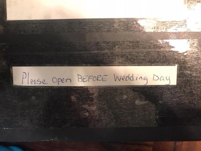 "Vui lòng hãy mở ra trước ngày cưới", trên hộp quà viết.