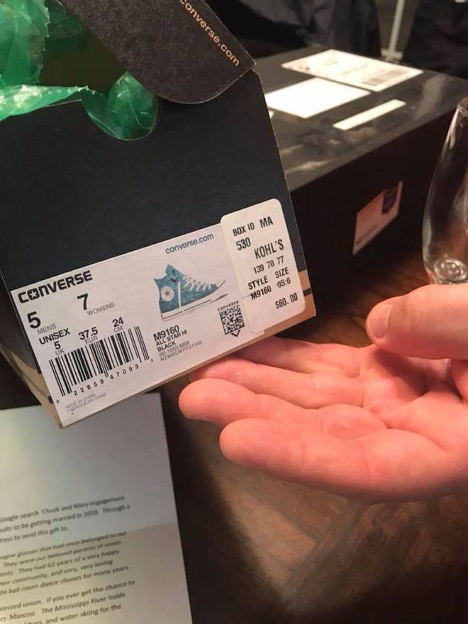 Cả Mary và Chuck đều vô cùng kinh ngạc trước lời chúc và món quà mang giá trị tinh thần lớn mà họ nhận được từ 7 anh chị em nhà Felker. Tuy nhiên sự trùng hợp không chỉ dừng ở đó. Mary cho hay, món quà được gửi đến trong một hộp giày Converse - cũng chính là loại giày mà cô dâu dự tính sẽ mang trong hôm đám cưới.