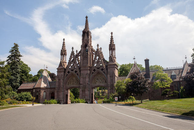 Vào cuối thế kỷ 19, đầu thế kỷ 20, Green-wood là lựa chọn hàng đầu cho tầng lớp thượng lưu ở New York, hoạt động trong các lĩnh vực kinh doanh, nghệ thuật, công nghiệp và chính trị. Rộng hơn 190 ha, được xây cất vào năm 1838, nơi đây trông giống một khu nghỉ dưỡng cao cấp hơn là nghĩa trang cho người đă khuất. Trong ảnh: Cổng vào Green-wood xây dựng theo kiến trúc tân cổ điển.