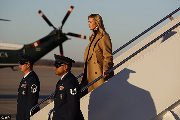 Ivanka Trump gây ấn tượng khi bước ra từ chuyên cơ tổng thống. Ái nữ nhà Trump được nhận xét ra dáng "nữ tổng thống tương lai". Cô tự tin và kiêu hãnh bước ra từ Air Force One.