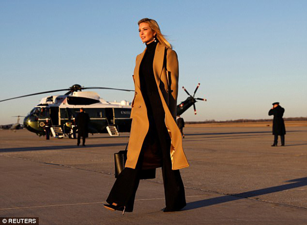 Những bức ảnh chụp Ivanka tự tin, kiêu hãnh bước từ chuyên cơ xuống căn cứ trên đang đốn tim người hâm mộ trên mạng xã hội. Trong ảnh, con gái cả ông Trump thể hiện thần thái thanh lịch, tự tin của một người được sinh ra để làm lãnh đạo. Cô mặc áo len đen bên trong, khoác chiếc lông cừu màu vàng bên ngoài.