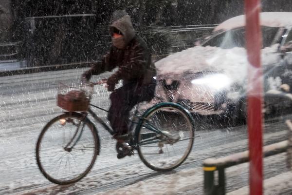 Yuri Nakano, 28 tuổi, mệt mỏi trông thấy sau khi phải chờ taxi khá lâu tại ga Shimbashi. "Mai tôi phải đi làm sớm. Tôi muốn bắt taxi về nhà nhưng đã chờ tới gần 1 tiếng rồi", Nakano nói. Trong ảnh, một người dân dắt xe đạp đi trên con đường tuyết phủ trắng xóa.