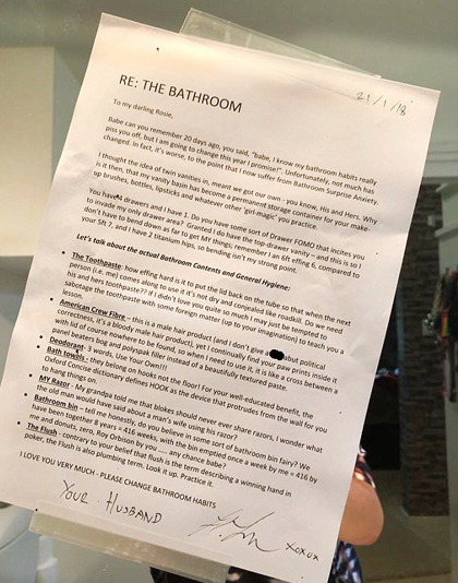 Một người ở Brisbane (Queensland), Australia đã ra một tối hậu thư cho vợ. Trong đó anh ta liệt kê toàn bộ thói xấu của vợ trong phòng tắm và yêu cầu phải thay đổi. Ngay lập tức bản cáo trạng này đã gây "sốt" mạng.
