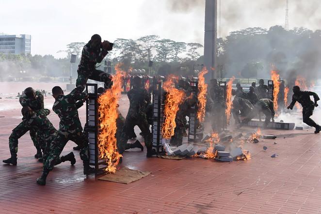 Các binh sĩ Indonesia uống máu rắn, đi qua lửa, đập vỡ bê tông bằng đầu, dùng tay đánh vỡ gạch nóng. Một binh sĩ còn bịt mắt bắn vỡ quả bóng kẹp giữa chân đồng đội.