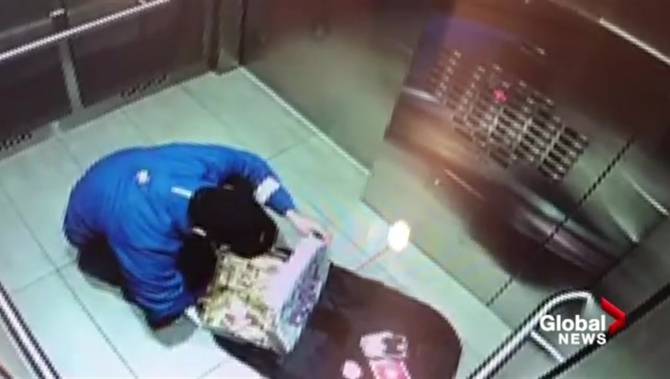 Đoạn video, do camera an ninh lắp trong thang máy một tòa nhà ở Surrey, British Columbia (Canada), ghi lại vào đêm 21/1.