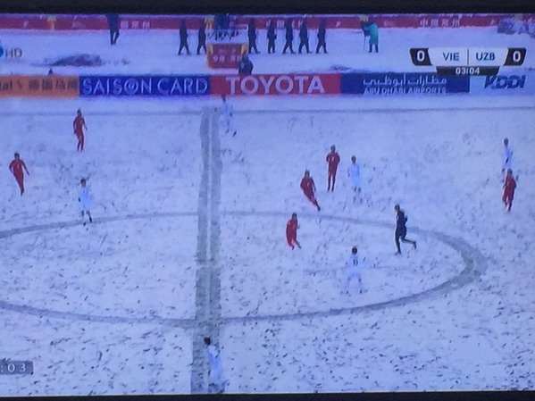 Trong hiệp một, cầu thủ Uzbekistan mặc áo trắng khiến khả năng quan sát bị hạn chế trong trời tuyết. Điều này khiến họ phải thay trang phục sang màu xanh da trời ở hiệp hai.
