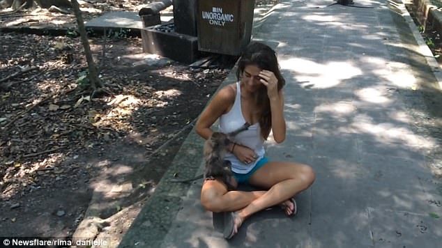 Khoảnh khắc hài hước này được người chồng ghi lại tại khu rừng khỉ ở Bali, Indonesia. Trong video, con khỉ vây lấy nữ du khách khi cô đang ngồi quay phim cùng chồng.