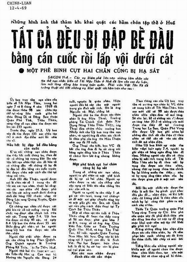 Tất cả bị trói, bắt đứng quay lưng vào tường thành. Dân chúng đứng coi. Súng AK nổ. Từng người gục chết. Sau cuộc hành hình, thân nhân những người bị bắn nhào ra muốn ôm xác. Họ bị đánh, bị đá, bị đuổi. Xác người bị phơi ngày phơi đêm. Nắng. Máu. Giòi bọ… Và cuộc tàn sát tiếp tục. Không bằng súng đạn mà bằng cách chôn sống. Những nạn nhân bị cột trói bằng dây điện dính chùm xếp hàng bên hố. Một vài người bị đập đầu. Cả dây người đang sống bị đạp xuống hố đè lên nhau. Cái đầu nào ngóc lên bị đập bằng cuốc. Cứ thế mà chôn hàng ngàn người. Bạn tôi, chị Tâm Túy cũng đã bị chôn sống. Khi xác đào lên, thấy hai tay chị vói lên như đang cố cào bới đất. Móng tay, móng chân mọc dài hơn. Tóc mọc dài hơn… Bạn tôi bị chôn sống khi còn đầy sức sống... Huế Tết Mậu Thân. Hàng ngàn người đã bị chôn sống như thế” (Việt Báo ngày 31-3-2008).