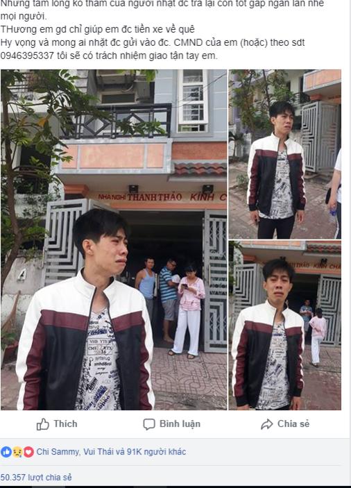 Cụ thể, tài khoản Thao Dao chia sẻ: "Sáng ra là chuyện thế này mong mọi người nhủ lòng thương cho em ý nhé. Đêm qua em về quê Hà Trung, Thanh hóa bị trễ xe nên ghé nhà tôi nghỉ 7h em trả phòng, tôi trả lại CMND cho em. Em nhận rồi đi thẳng ra Quốc lộ 51 đón xe. Em ghé quán phở ăn sáng, khi xong lôi bóp trả tiền thì bị mất. Em chạy lại đi tìm nhưng không thấy đã vào nhà tôi hỏi. Thấy em khóc cả nhà buồn theo em. Em nói giờ không có tiền trả tô bún, không còn gì cả.