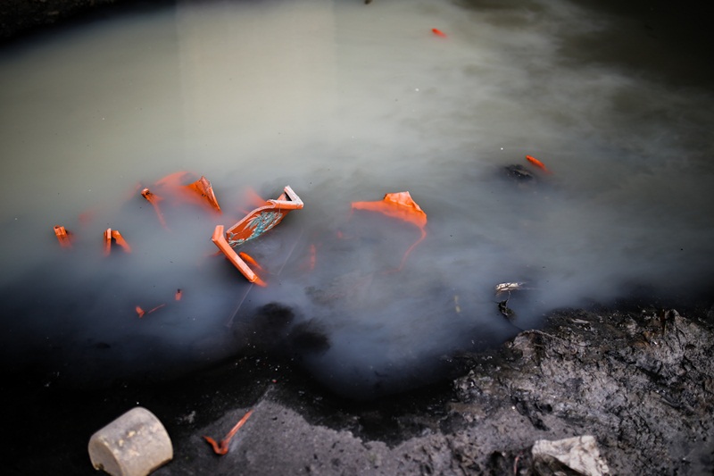 Cá được thả vào dòng nước đen đặc, bốc mùi nồng nặc.