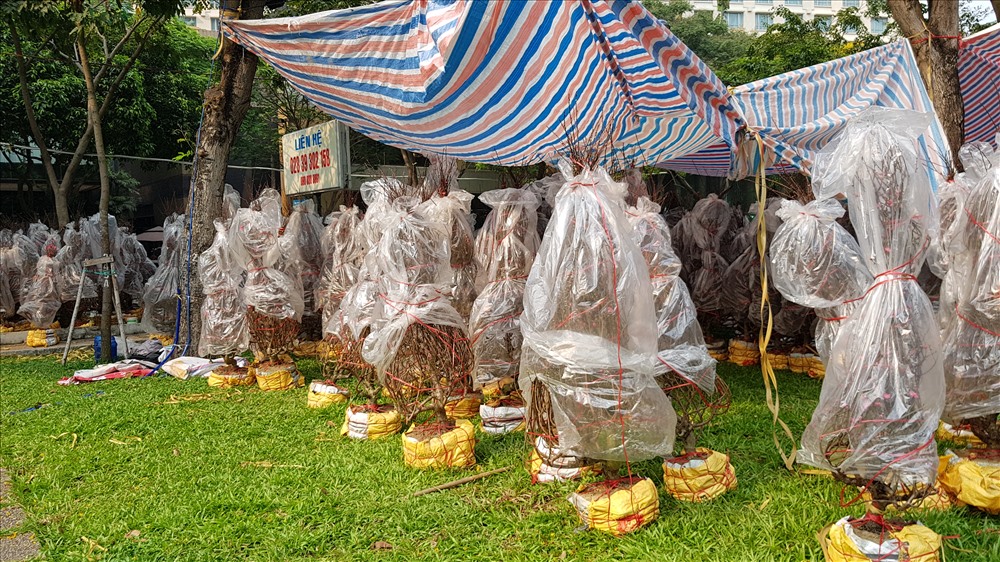 Ngoài ra, để đáp ứng nhu cầu đa dạng của người dân thành phố, nhiều thương lái cũng vận chuyển đào từ các tỉnh phía Bắc vào bán. Hiện giá của những cây đào được định giá từ 2-5 triệu đồng tùy kích cỡ. Cá biệt có nhiều cây đào trị giá hàng chục triệu đồng cũng sẵn sàng chờ chủ nhân rước về. Ảnh: Trường Sơn