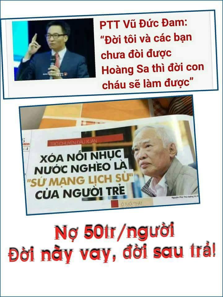 Thảo nào các đồng chí lănh đạo mới mạnh miệng đẩy tránh nhiệm cho thế hệ con cháu đến thế. Thế hệ tương lai của Việt Nam chúng ta c̣n lại toàn bọn dân ngu cu đen, bướm đen trông thấy tối thui cả giang sơn th́ làm ǵ mà phát triển đất nước thành Rồng hay Hạc. Bọn này ăn c̣n không đủ th́ sức đâu mà đi lấy lại Hoàng Sa với Trường Sa hở Trời...