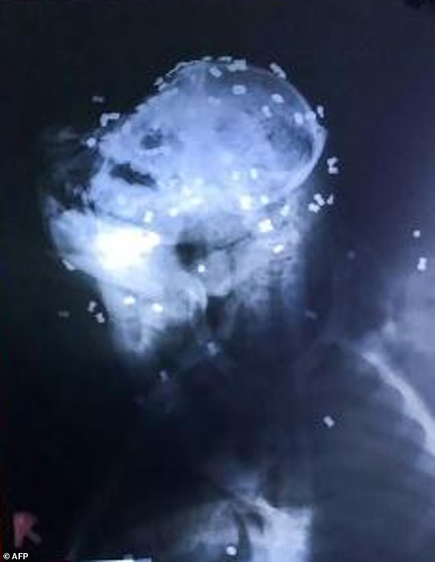 Phim chụp cho thấy 74 viên đạn súng hơi găm trong đầu, 17 viên ở ngực và hàng chục viên khác trên chân tay con đười ươi.