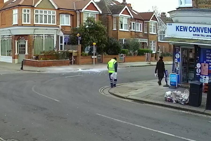 Sự việc xảy trên đường phố gần nhà ga tàu điện ngầm Kew Gardens ở thành phố London, Anh. Đoạn video do camera giám sát ghi lại cho thấy, công nhân vệ sinh Serhiy Myeshkov đang làm việc trên vỉa hè thì một tảng băng nặng khoảng 20kg từ máy bay trên bầu trời rơi xuống ngay sát người đàn ông.