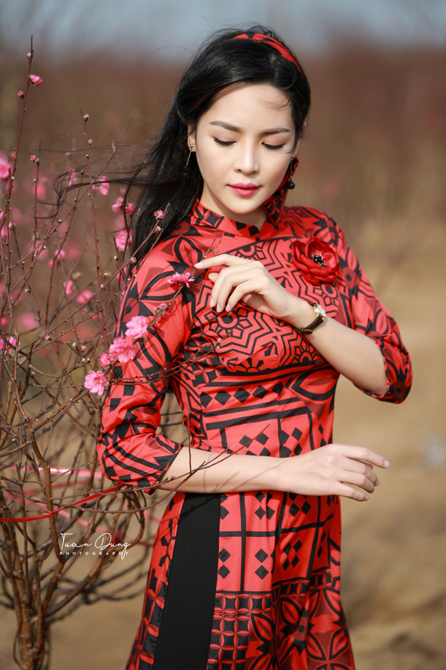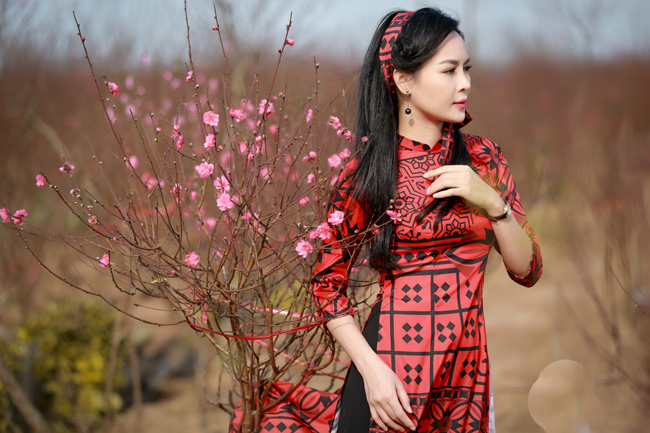 Cô nàng khoe vẻ đẹp tràn đầy sức sống với áo dài cách tân đỏ.