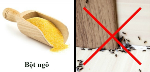 Cho vài nhúm bột ngô vào những nơi kiến hay đến lấy thức ăn và mang về tổ. Kiến rất sợ mùi này và chúng sẽ bỏ đi hết.