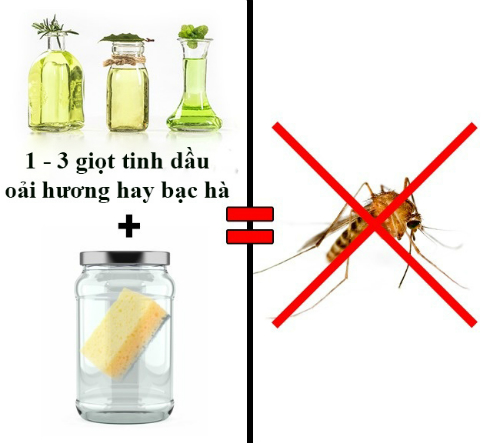 Cho vài giọt tinh dầu vào một miếng bọt biển sạch, sau đó cất miếng bọt biển vào một cái lọ và đóng nắp lọ trong vòng 24h để tinh dầu thấm đẫm vào bọt biển. Đến khi bạn mở nắp lọ ra, mùi tinh dầu bay khắp phòng sẽ khiến muỗi sợ mà chết hoặc bay đi mất.
