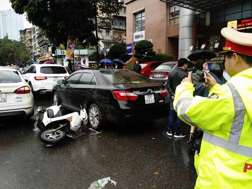 Chiếc xe ô tô màu trắng mang BKS 30A – 873.74 đi trên đường Huỳnh Thúc Kháng tông trúng một chiếc xe máy màu trắng hiệu Honda đang dừng đèn đỏ rồi tiếp tục tông thẳng vào phía sau một chiếc xe ô tô Hyundai màu xám.