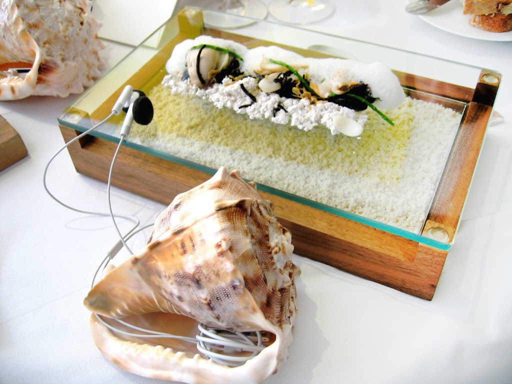 "Âm thanh của biển cả" là một món ăn độc, lạ có tiếng, chính bởi thế mà khiến nhiều người tò mò và muốn trải nghiệm ngay lập tức. Một bộ sưu tập lạ lùng các loài thực vật thu nhỏ, cát, bọt biển… nhìn qua chẳng ai nghĩ có thể ăn được. Thế nhưng thực chất chúng lại được tạo nên bởi các nguyên liệu như bột chiên, lươn, cà rốt, trai và rất nhiều những thứ khác (tất nhiên là có thể ăn được).