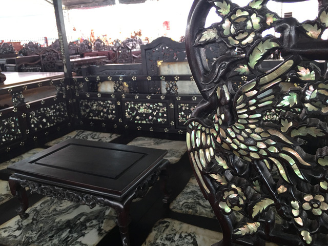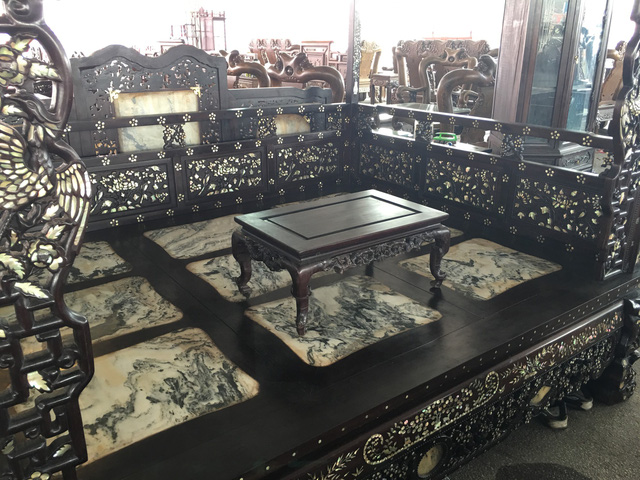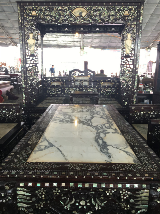 “Nhưng chơi cái này nên chơi cả bộ, nếu không thì nên chơi kiểu “trường kỷ ngũ sơn khảm ốc”. Vì bộ đó có 1 ghế dài hoặc 2 ghế dài, chơi thế đúng kiểu hơn. Vì thế, tôi thường khuyên khách mua cả bộ bàn ghế và long sàng luôn”, người chủ cho biết thêm.