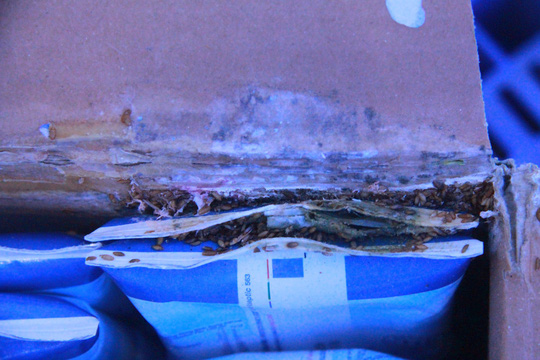 Chiều 22-2, con gái của anh Nghĩa khui thùng sữa TH True Milk dạng bịch, lấy một bịch ra để uống thì anh Nghĩa ngửi mùi hôi khó chịu nên đến kiểm tra thì tá hỏa phát hiện một góc thùng sữa có rất nhiều con dòi đang bò lúc nhúc.