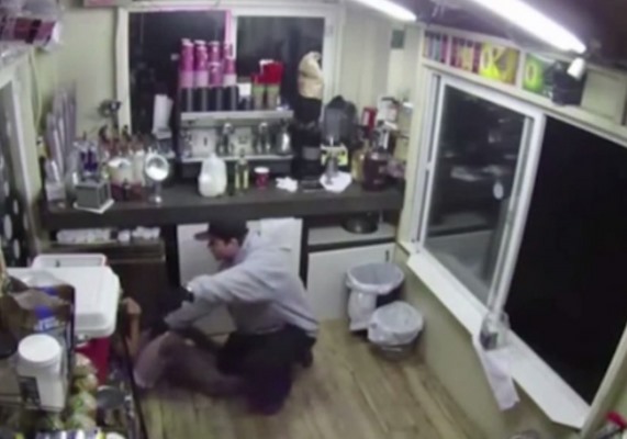Vụ việc nghiêm trọng được camera an ninh ghi lại tại một quán giải khát tại Anh. Khi nữ nhân viên mặc bộ bikini đang pha cà phê cho khách, bất ngờ người đàn ông cầm dao nhảy vào trong.