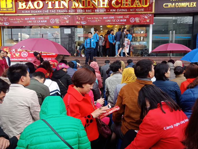 Đến khoảng 9 giờ 30, nhiều cửa hàng vàng tại TP mới đông nghẹt khách, nhiều khách hàng phải xếp hàng chờ tới lượt để mua vàng cầu may.