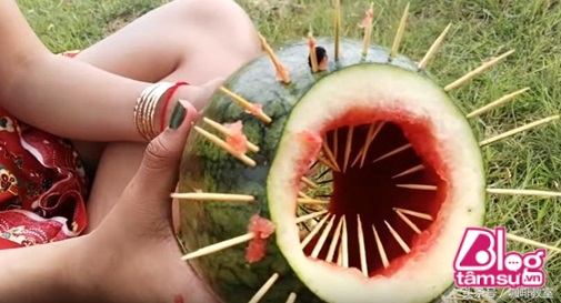 Một cô gái khá sáng tạo khi sử dụng một trái dưa hấu. Đầu tiên cô gái lấy hết ruột quả dưa ra ngoài, sau đó cắm tăm nhọn quanh trái dưa và thả xuống mương nước. Thành quả sau đó khiến thật bất ngờ.