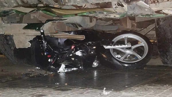 Một chiếc xe máy bị cuốn vào gầm xe, biến dạng