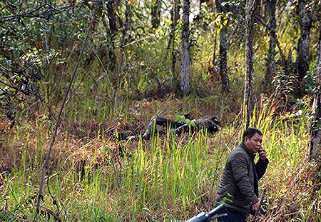Đang í ới ra hiệu chụp ảnh cho nhau, nhóm du khách hoảng hồn nhìn thấy một xác người cháy đen trong rừng thông, xung quanh có một số vỏ chai bằng nhựa.