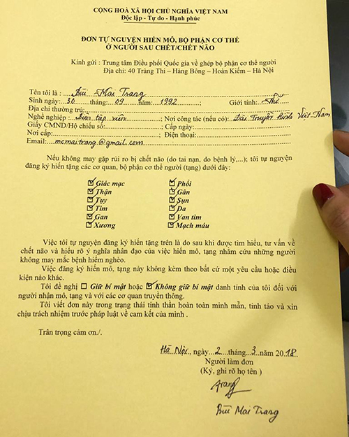 Ngày 2/3, trên trang cá nhân của mình, MC Mai Trang đã chia sẻ hình ảnh cô làm thủ tục đăng ký hiến cơ thể cho y học. Nữ MC của Cà phê sáng với VTV3 viết: "Chúng tôi, hôm nay, đã cùng nhau ký vào tờ giấy Đăng ký hiến mô, tạng. Trong đó, chúng tôi đồng ý hiến tất cả các mô và tạng có thể nếu không may chết não, qua đời, với ước mong khi trở về cát bụi vẫn có thể tiếp tục thắp sáng, viết tiếp cuộc đời của nhiều người khác".
