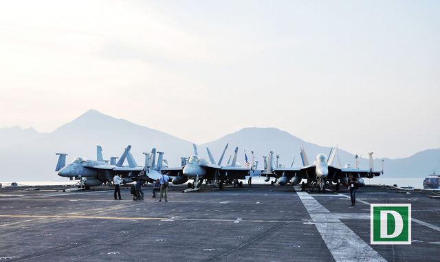 Trên tàu sân bay Mỹ USS Carl Vinson của Hải quân Mỹ đang neo đậu ở vịnh Đà Nẵng có khoảng 70 máy bay, trong đó có cả tiêm kích và máy bay do thám.